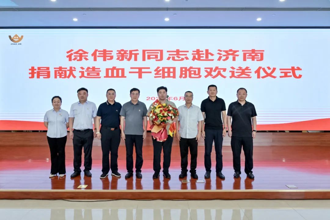 6月17日,一场隆重而温馨的捐献造血干细胞欢送仪式在招金大厦举行。金亭岭矿业安全环保科科长徐伟新即将启程,为素不相识的血液病患者捐献“生命种子”——造血干细胞。招远市红十字会、招金集团、招金矿业的有关领导共同出席,为这位勇敢的“生命使者”送上最崇高的敬意和最温暖的祝福。