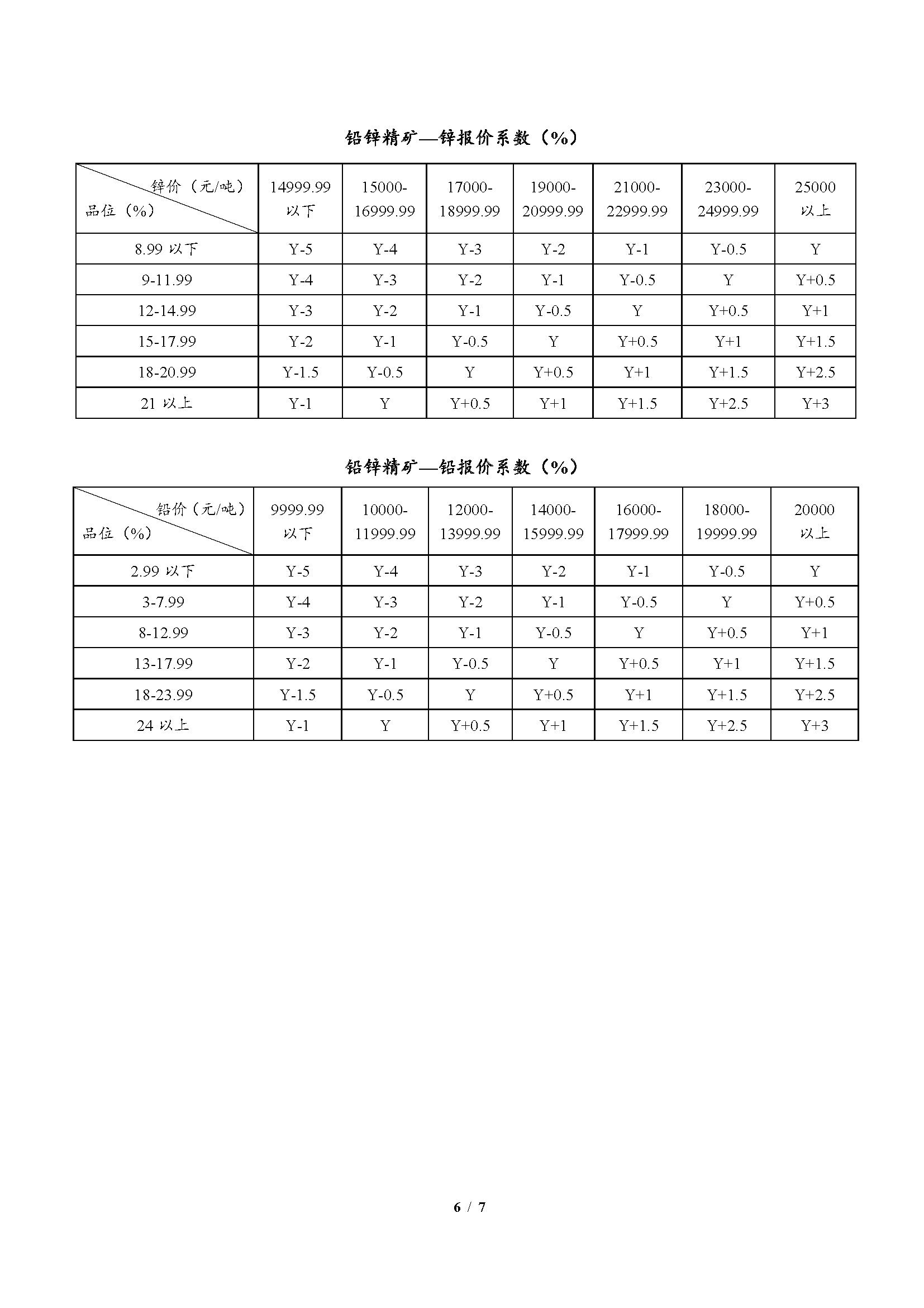 4.结算以点价方式确定,在货物拉运后进行点价,点价为提货之日起10个工作日内的加权平均价,不含发运货物当天,金结算价格按照上海黄金交易所AU(T+D)加权平均价为准;银结算价格以上海黄金交易所AG(T+D)加权平均价为准;铜结算价格以上海有色金属网SMM1电解铜加权平均价为准;铅结算价格以上海有色金属网SMM1#铅锭加权平均价为准;锌结算价格以上海有色金属网SMM1#锌锭加权平均价为准。