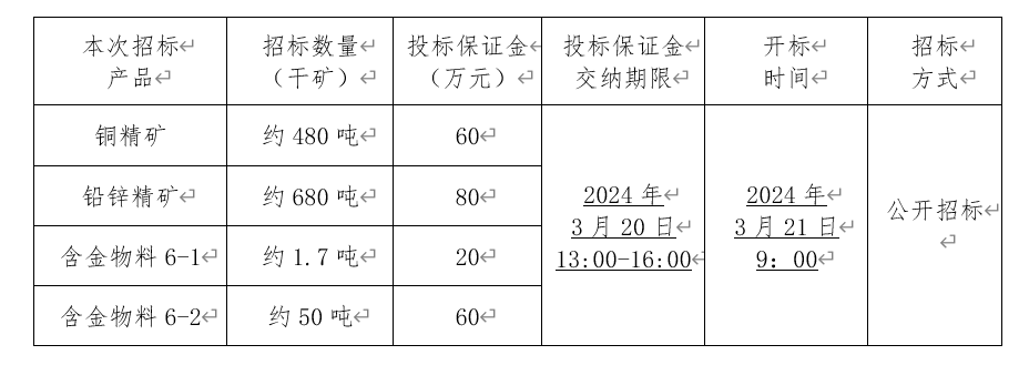 本次招标副产品为我公司含金物料。投标人需提供“三证合一”的营业执照复印件(个人提供身份证复印件)、法人授权委托书(原件)并加盖企业公章,于2024年3月19日16:00前将上述材料送交我公司企管审计科进行审核,审核合格后的单位应于2024年3月20日下午13时-16时交纳投标保证金(见下表,保证金须以转账方式支付)。如在2024年3月20日下午16时前投标保证金未足额汇入我公司账户则视为放弃本次投标;若投标人最终未中标,则由投标人开具收款收据后,我公司将一次性无息退还投标保证金。